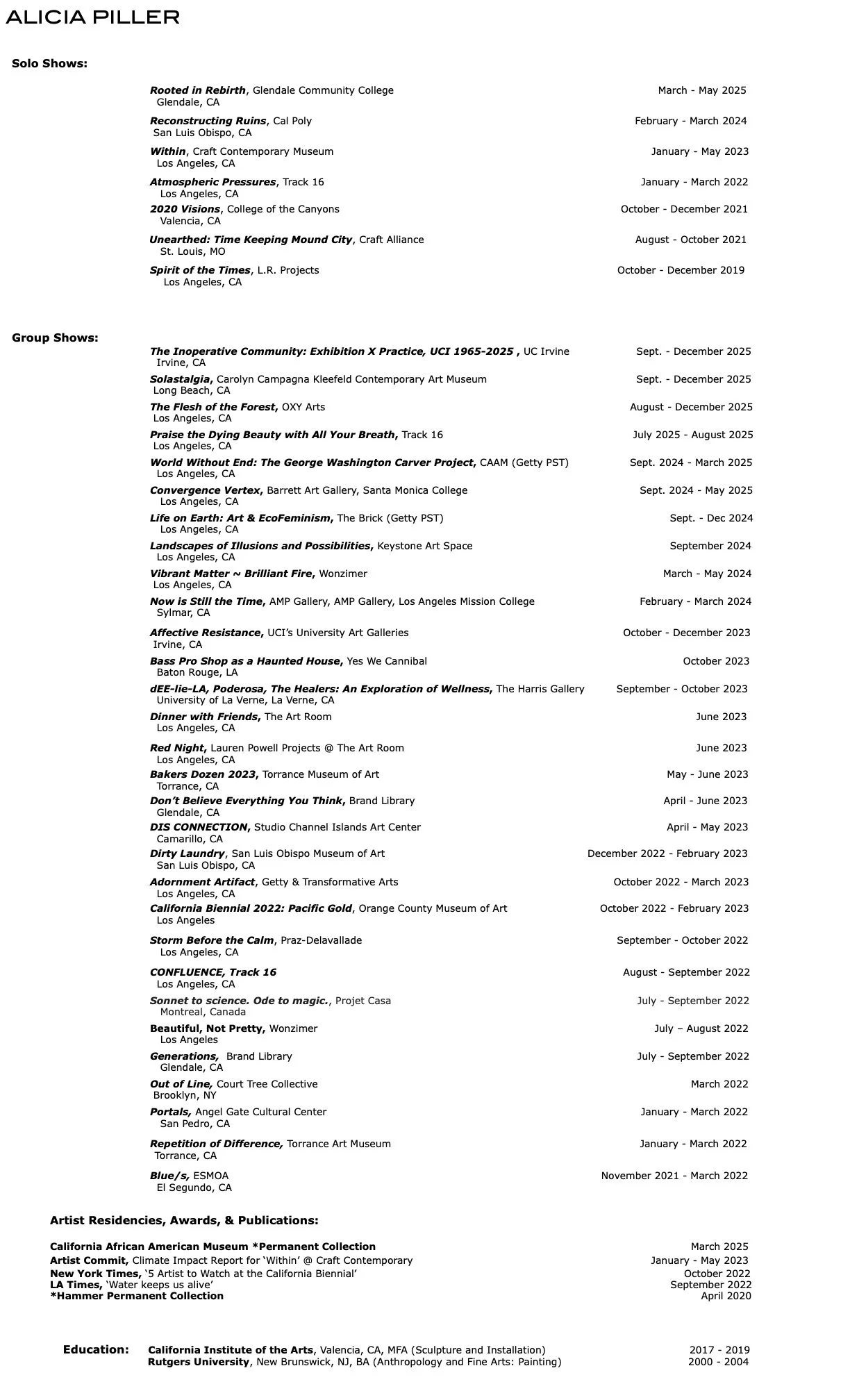 BIO: Los Angeles based artist, Alicia Piller was born and raised in Chicago and received her Bachelors in both Fine Arts (Painting) & Anthropology from Rutgers University in 2004. While working in the fashion industry; living a decade in NYC and three and a half years in Santa Fe, NM, Piller cultivated her distinctive sculptural voice. Continuing to expand her artistic practice, Alicia completed her MFA focused on sculpture and installation from CalArts in May of 2019. Alicia is currently represented in Los Angeles by Track 16 Gallery. Her work is a part of the Hammer Permanent Collection 2020, Glendale College Collection, Forrest Kirk Collection, the Pam Royalle Collection, & Janine Barrois Collection. Her sculptural work was featured on the cover of Full Blede Magazine, Issue 10 (Fall 2019), the Lumina Journal (Sarah Lawrence College) (Jan 2020), and the LA Times (August 2022).